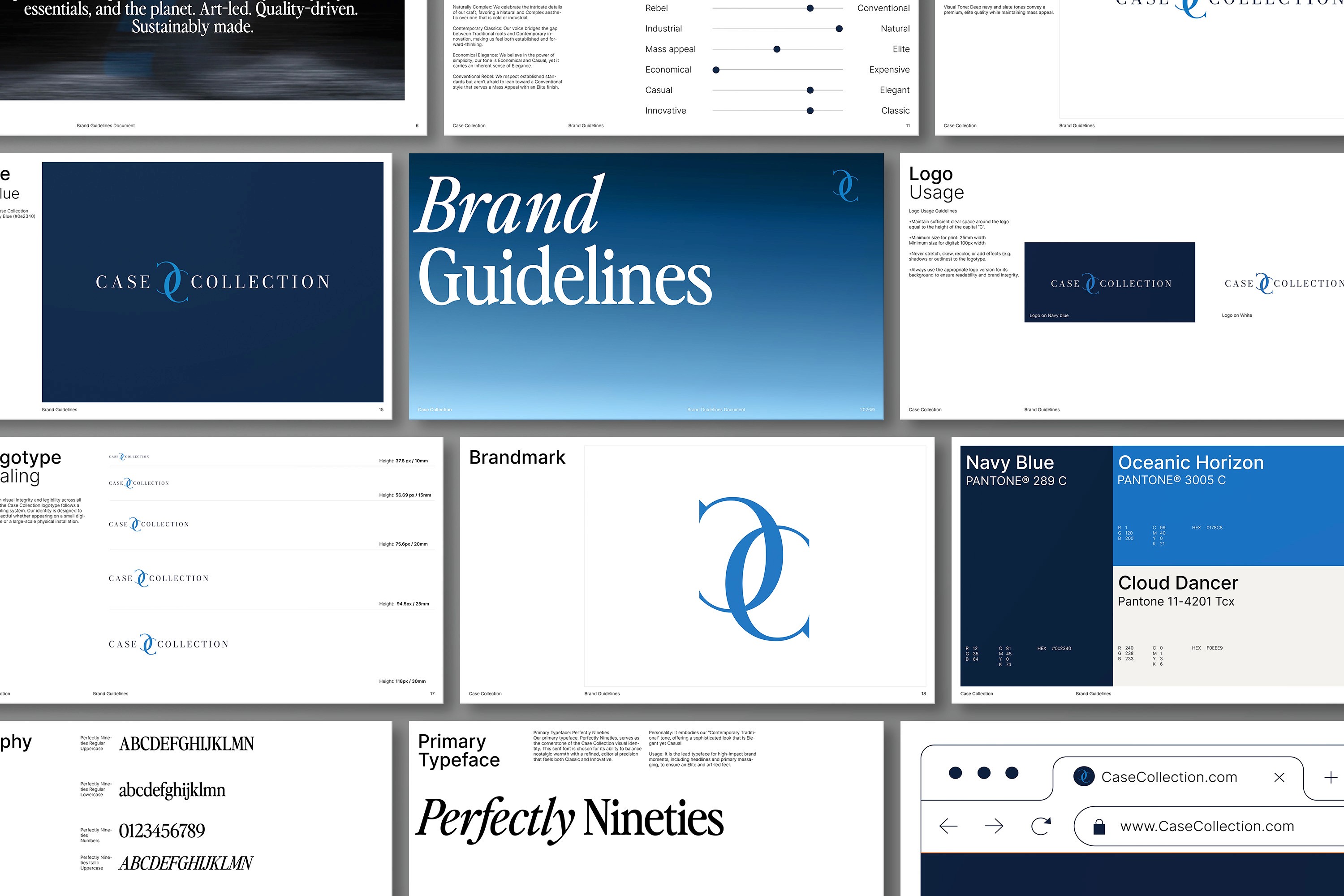 With the brand purpose established, I crafted the name and visual identity. The name takes inspiration from the art world; treating every case as a curated piece rather than a commodity. Using "refined responsibility" to ignite ideas, a visual system was created with a deep oceanic palette, timeless serif typography, and an interlocking mark representing the circular nature of their recycled materials.